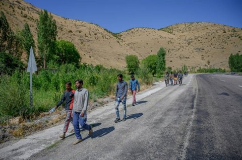| Des migrants marchent le long d'une route depuis la frontière iranienne et la ville de Tatvan, dans la région du lac de Van, le 24 août en Turquie. |