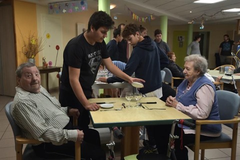 Avant les vacances scolaires, jeunes et moins jeunes mangent ensemble, pour marquer le coup avant une séparation un peu plus longue que d'habitude. Ce midi, ce sont Alexis, Romain et Nicolas, qui mettent le couvert, avant de s'installer avec les résidents.