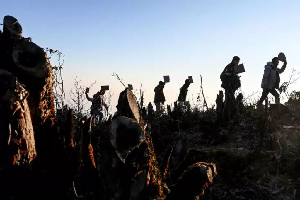 | Des arbres abattus pour la construction d'un téléphérique menant au temple Pathibhara Devi, dans le district de Taplejung, le 23 janvier au Népal. |