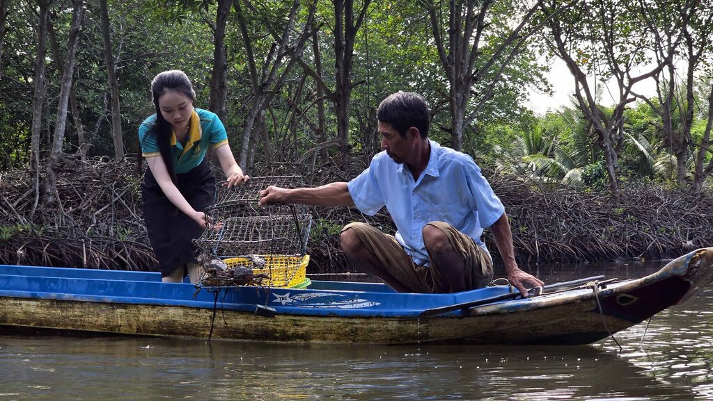 | Une touriste fait l’expérience de la pose des casiers à crabes dans un élevage de crevettes à Cà Mau. |