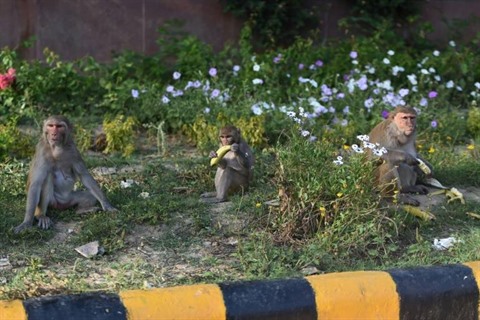 | Des singes sur le bas-côté d'une rue à New Delhi, le 8 avril. |