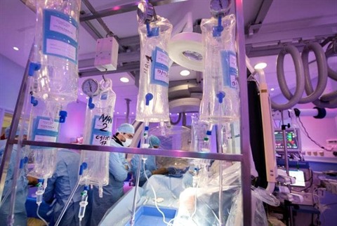 | Les neuroradiologistes opèrent un patient affecté par une malformation artério-veineuse cérébrale, à la Fondation de Rothschild, le 12 juin à Paris. |
