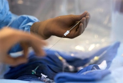 | Un neuroradiologiste de la Fondation Rothschild introduit un cathéter qui injecte une colle pour obstruer certains vaisseaux trop étroits, afin de canaliser la circulation sanguine vers des voies. |