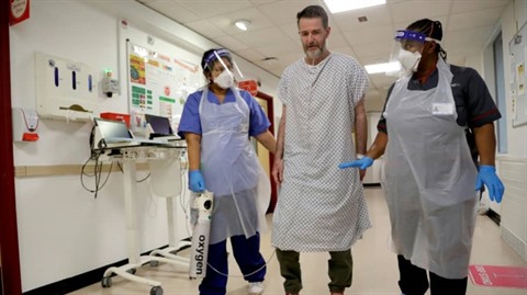 | Des infirmières aident le patient Justin Fleming à remarcher après avoir été malade du COVID-19, à l'hôpital King's College de Londres, le 27 janvier. |