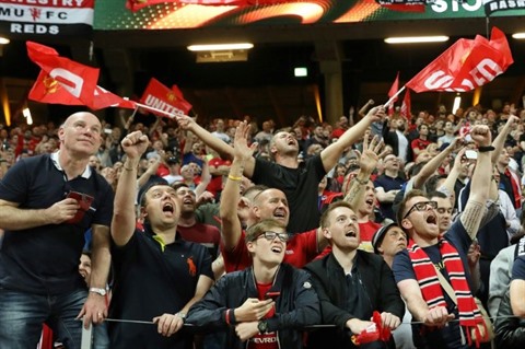 | Des supporters de Manchester United le 24 mai à Stockholm lors de la finale de l'Europa League. |