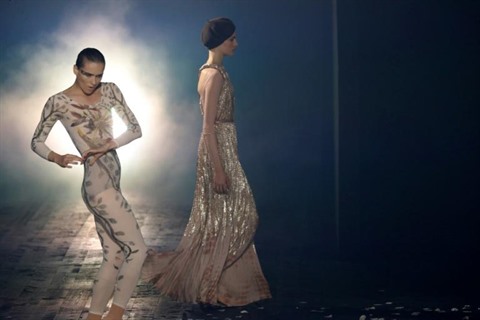 Les modèles en robes évanescentes ont frôlé les danseurs dans la brume et une pluie de pétales en papier sur une scène montée spécialement pour ce défilé dans l'hippodrome de Longchamp, dans l'ouest de Paris.