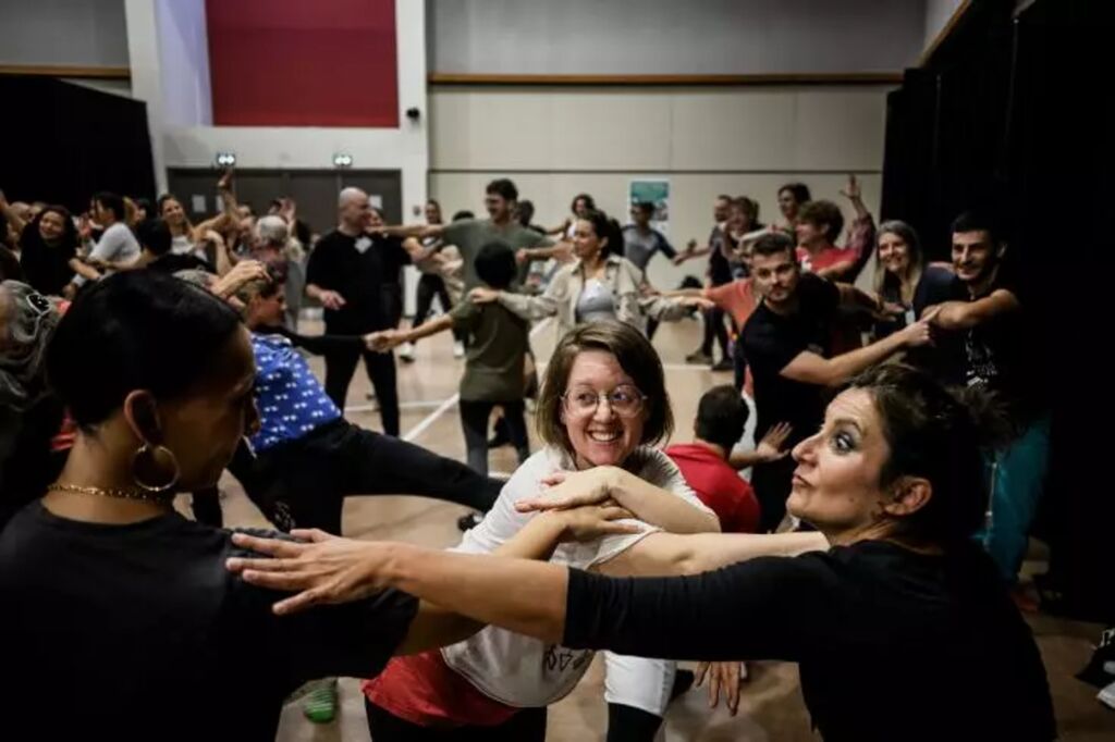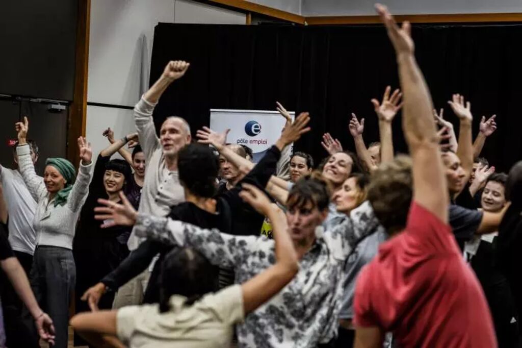 Le premier atelier s'est déroulé cette semaine dans une salle de répétition à Bron, dans la banlieue lyonnaise, avec une série d'exercices en musique réunissant une soixantaine de participants de tout âge et de toute condition physique, pieds nus, en chaussettes ou chaussures de sports.