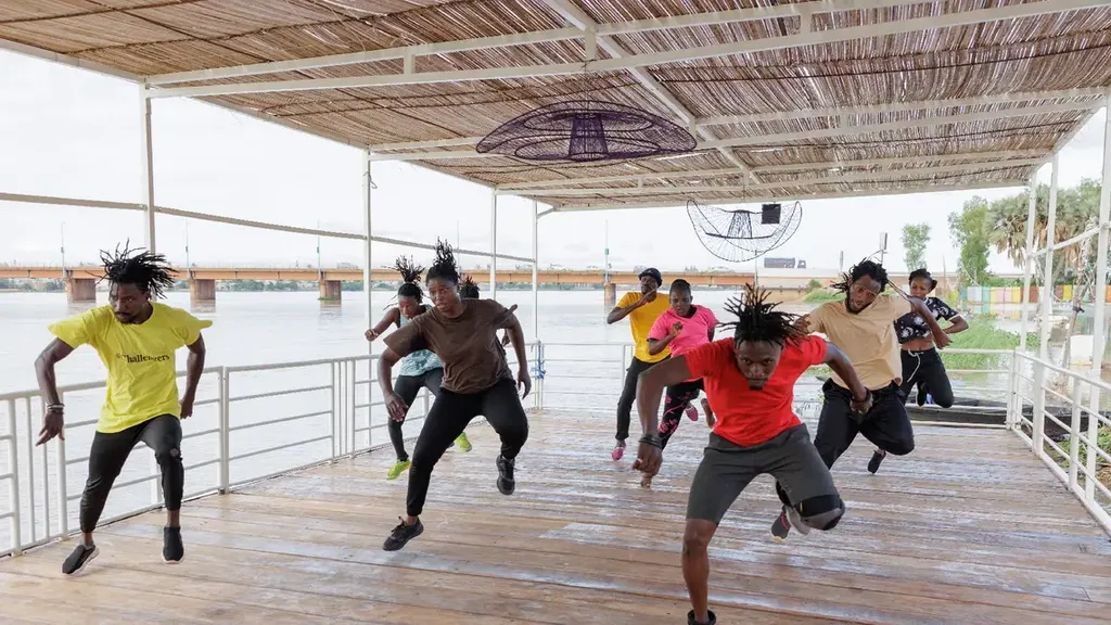 | Des danseur de l'Association culturelle Don Sen Folo Lab s'entraînent avant l'inauguration du premier bateau de résidence d'artistes sur le fleuve Niger, au Mali |