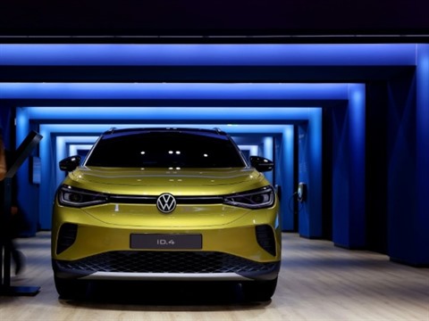 | Un modèle de voiture électrique, l'ID.4, présenté au siège de Volkswagen, à Wolfsburg en Allemagne, le 26 octobre 2020. |