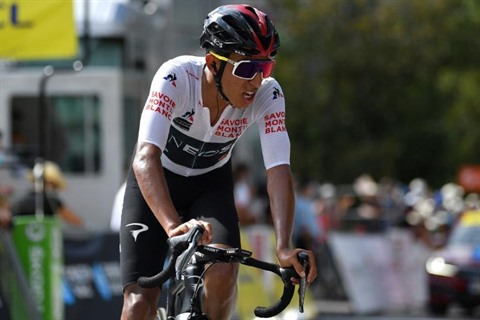 | Egan Bernal à l'arrivée de la 3e étape du Dauphiné, le 14 août à Saint-Martin-de-Belleville. |