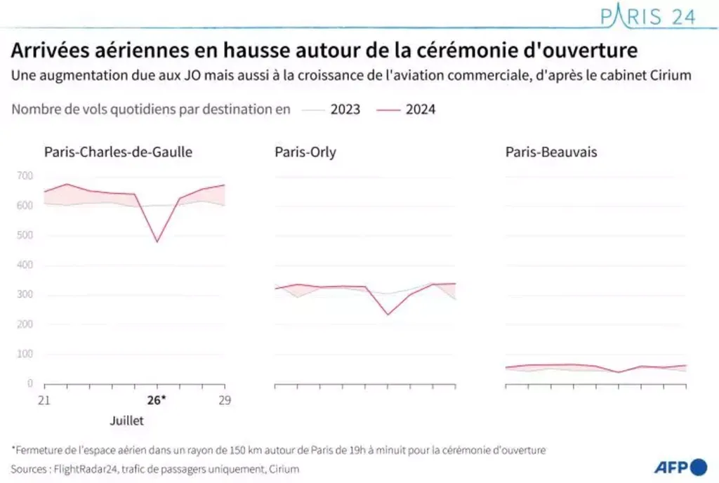 La période entre le 21 et le 29 juillet a coïncidé avec l'arrivée de 9.150 avions transportant des voyageurs vers la capitale, venant ou pas pour les JO, soit 365 de plus sur un an, d'après les chiffres de l'entreprise suédoise Flightradar24 spécialisée dans le suivi du trafic aérien.