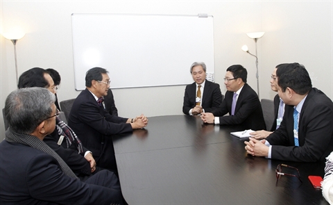 | Le vice-Premier ministre Pham Binh Minh a eu une rencontre le 22 janvier, en marge du 45e Forum économique mondial à Davos, avec son homologue thaïlandais Devacula Pridyathorn. |