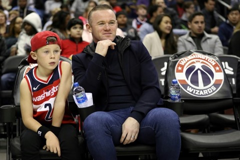 | Wayne Rooney regarde un match de NBA à Washington avec son fils le 2 décembre 2018. |