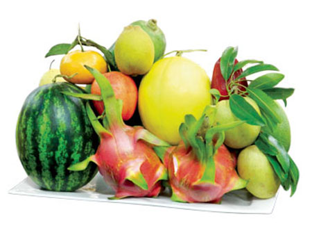 | Pendant les jours du Têt, chaque famille présente un plateau de cinq fruits (au moins) devant l’autel des ancêtres. |