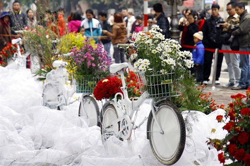 | Une rue piétonne de la capitale vietnamienne parée de ses plus beaux habits, pendant Têt traditionnel. |