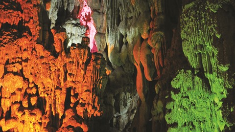 Après avoir franchi la porte étroite, la grotte s’ouvre sur une salle rectangulaire de 130 m de long. En son centre, quatre piliers naturels supportent le "toit du paradis". De leur base à leur sommet, ces piliers semblent représenter des scènes vivantes : oiseaux, poissons et tableaux de la vie quotidienne. Sur les murs, une fresque engravée au fil des âges offre le spectacle de constellations de fées qui dansent et chantent en l’honneur d’un mariage. Le vent résonne dans les entrailles de la terre et rappelle les sons rythmés des fêtes villageoises, tandis que la voûte immense et les stalactites bleutées plongent le visiteur dans un monde merveilleux.