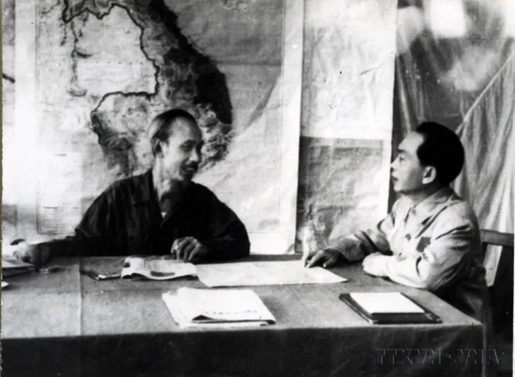 | Le Président Hô Chi Minh (gauche) chargea le Général Vo Nguyên Giap d'étudier le plan opérationnal et d'ouvrir la campagne de Diên Biên Phu. |