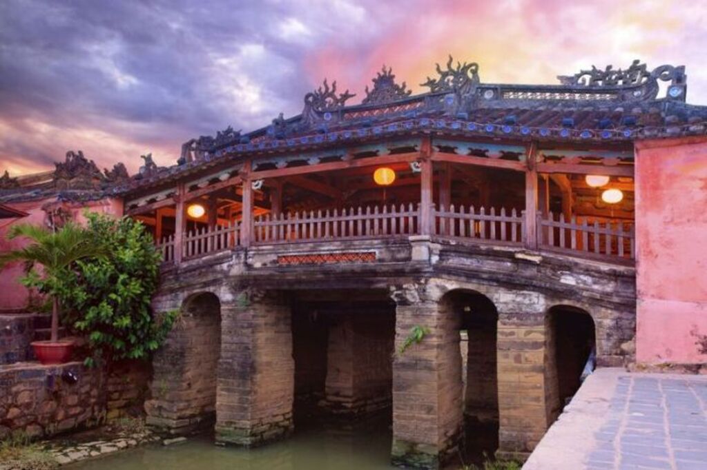 | Le pont couvert japonais (Chùa Cầu), joyau architectural emblématique du site du patrimoine culturel mondial de la vieille ville de Hôi An, à Dà Nang. |