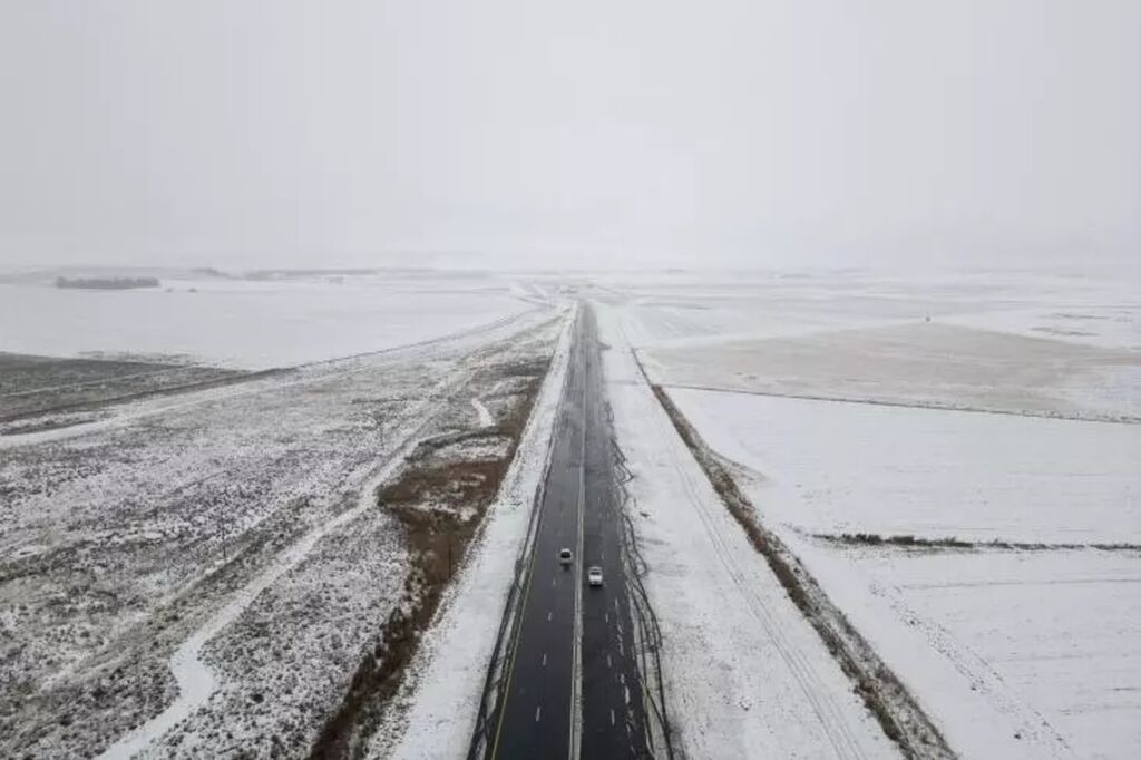 | Vue aérienne d'une route après des chutes de neige d'une ampleur inhabituelle près de Warden, en Afrique du Sud, le 21 septembre. |