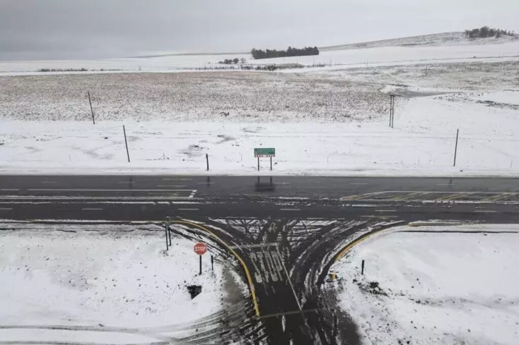 | Vue aérienne d'une intersection sur une route après des chutes de neige d'une ampleur inhabituelle près de Warden, en Afrique du Sud, le 21 septembre. |