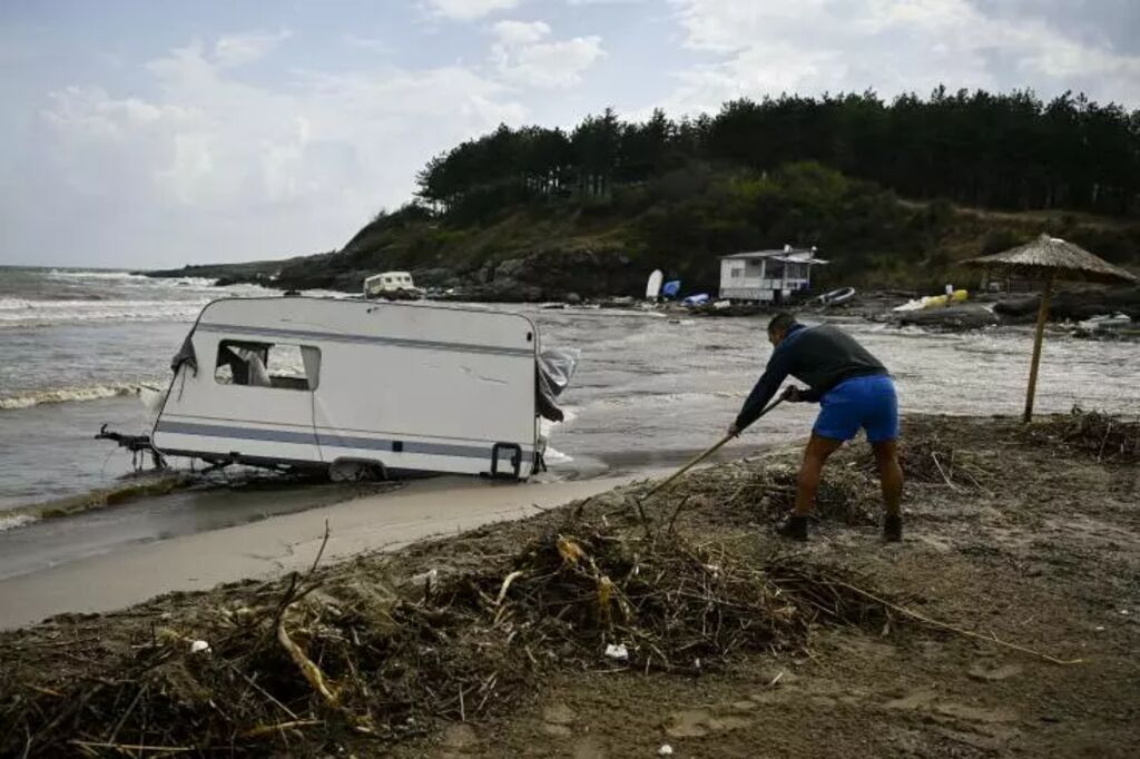 | Un homme déblaie les débris près d'une caravane échouée au bord de la mer Noire, au camping d'Aravia près de Tsarevo en Bulgarie le 6 septembre. |