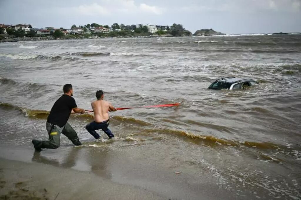 | Des gens tentent de tirer hors de la mer une voiture au camping d'Arapia près de Tsarevo en Bulgarie, le 6 septembre. |