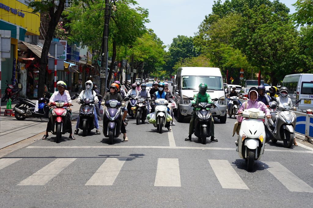 | Des habitants de Huê circulent dans les rues sous une chaleur accablante. |