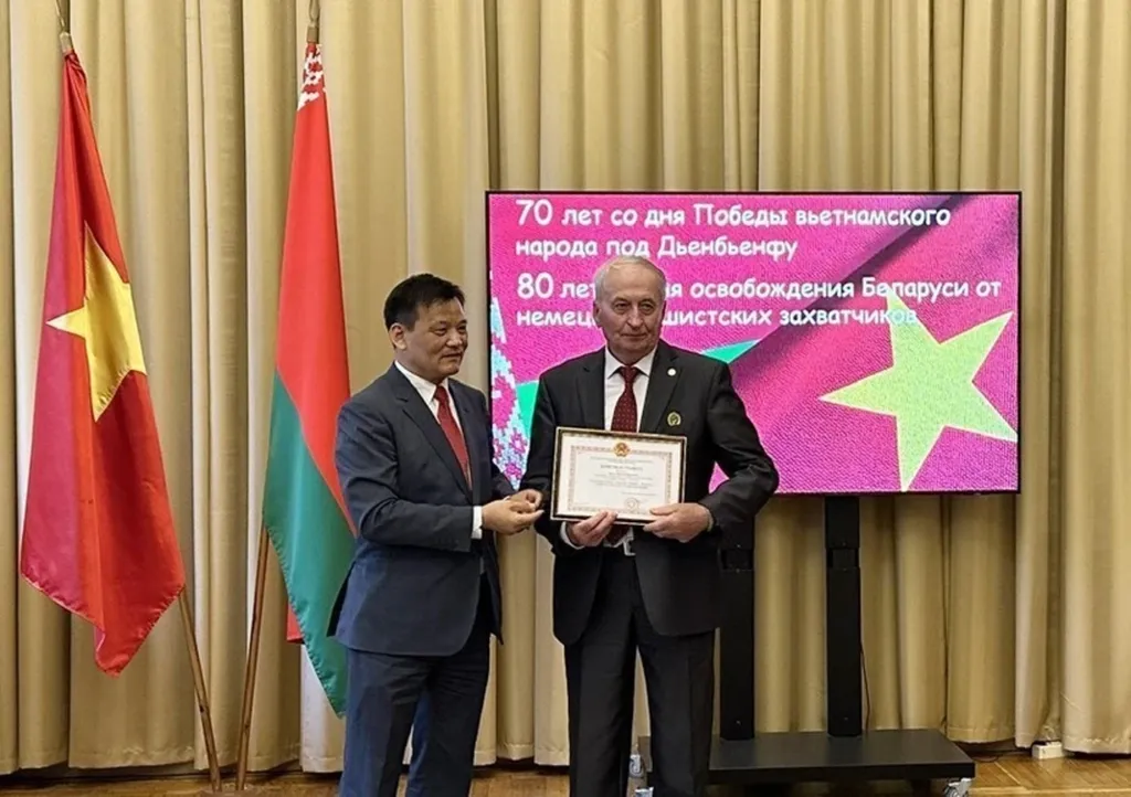 | L'ambassadeur du Vietnam en Biélorussie, Nguyên Van Ngu (gauche), remet des satisfecit à des Biélorusses ayant des contributions au renforcement de l'amitié entre les deux pays. |