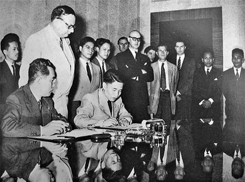 | Le vice-ministre vietnamien de la Défense, Ta Quang Buu (assis à droite), et le général français Henri Delteil signent en juillet 1954 les accords de Genève, marquant la fin de la guerre d’Indochine. |