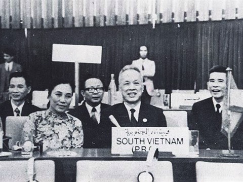 | Nguyên Huu Tho (centre) et la délégation du gouvernement révolutionnaire provisoire de la République du Sud-Vietnam à une conférence de haut rang du Mouvement des non-alignés en Algérie, en septembre 1973. |