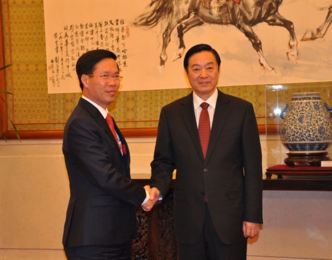 | Le membre du Bureau politique, secrétaire du CC du PCV et chef de la Commission de propagande et d’éducation du CC du PCV, Vo Van Thuong (gauche) et le chef du Département de la propagande du CC du PCC Liu Qibao, le 13 janvier à Pékin. |