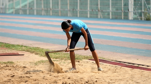 | Trân Huê Hoa balaie la piste d’élan du sautoir du stade Thông Nhât, puis lisse le bac à sable. |