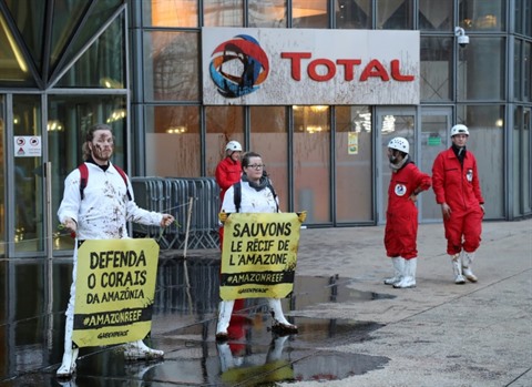 "Sauvons le récif de l'Amazone", "Total menace officielle du récif de l'Amazone", proclamaient les banderoles de la quinzaine de militants qui ont répandu la mélasse sur environ 400 m².