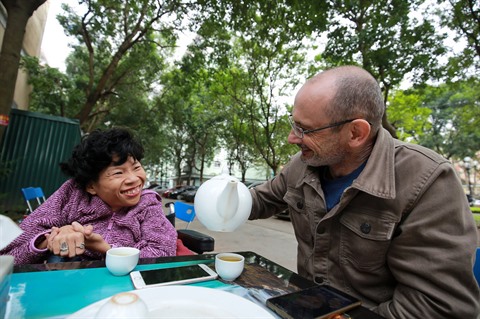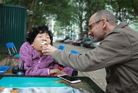 | Neil Bowden Laurence emmène Nguyên Thi Vân en fauteuil roulant en promenade. |