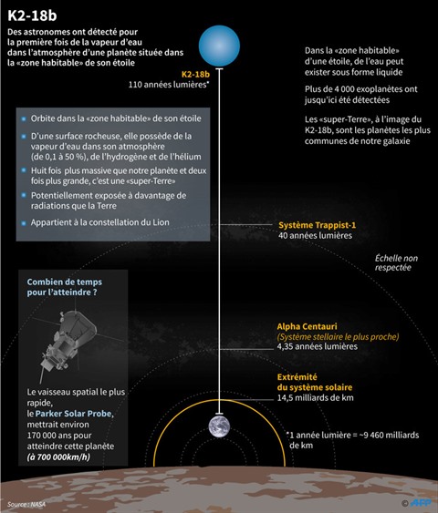 Découverte en 2015 par le télescope spatial américain Kepler, l’exoplanète, baptisée K2-18b, orbite autour de l’étoile K2-18, une naine rouge située dans la constellation du Lion, à 110 années-lumière du système solaire (une année lumière équivaut à 9.460 milliards de kilomètres).