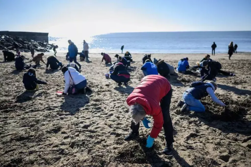| Ramassage de micro-billes de plastique sur une plage à Pornic, en Loire-Atlantique. |