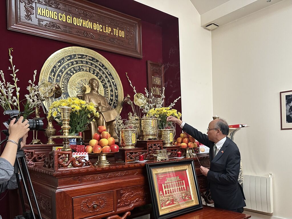 | L’ambassadeur Dinh Toàn Thang offrant de l’encens à l’autel du Président Hô Chi Minh dans l’enceinte de l’ambassade du Vietnam en France. |