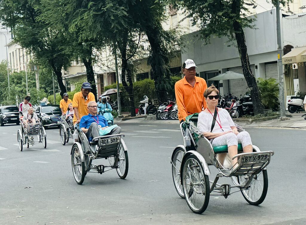 | Les touristes étrangers découvrant le centre-ville de Hô Chi Minh-Ville en cyclo-pousse. |