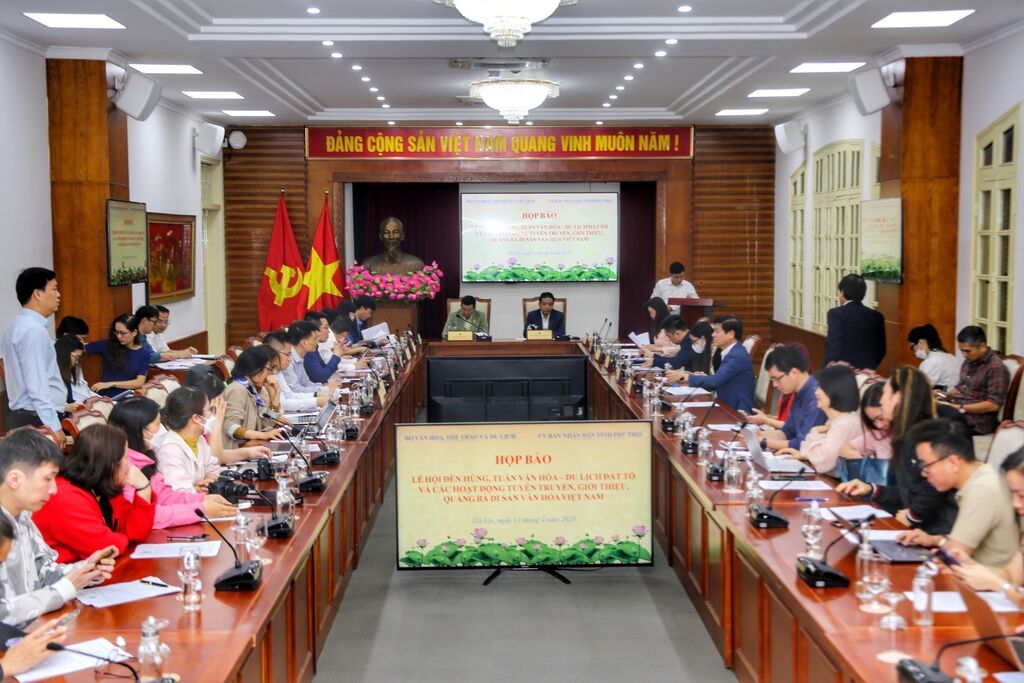 | Conférence de presse sur la Fête des rois Hùng 2023 et la Semaine culturelle et touristique de la terre ancestrale de Phu Tho, le 13 avril à Hanoï. |