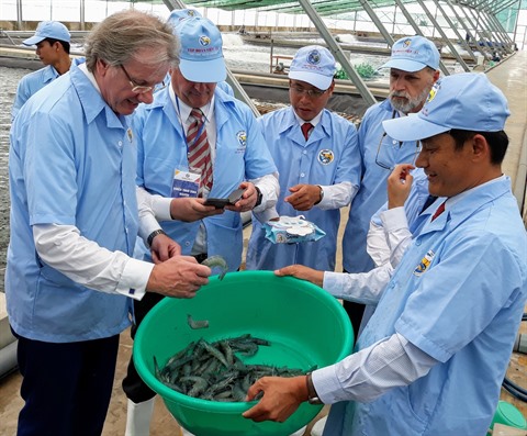 | Les experts australiens contrôlent la qualité des crevettes élevées à Bac Liêu (Sud). |