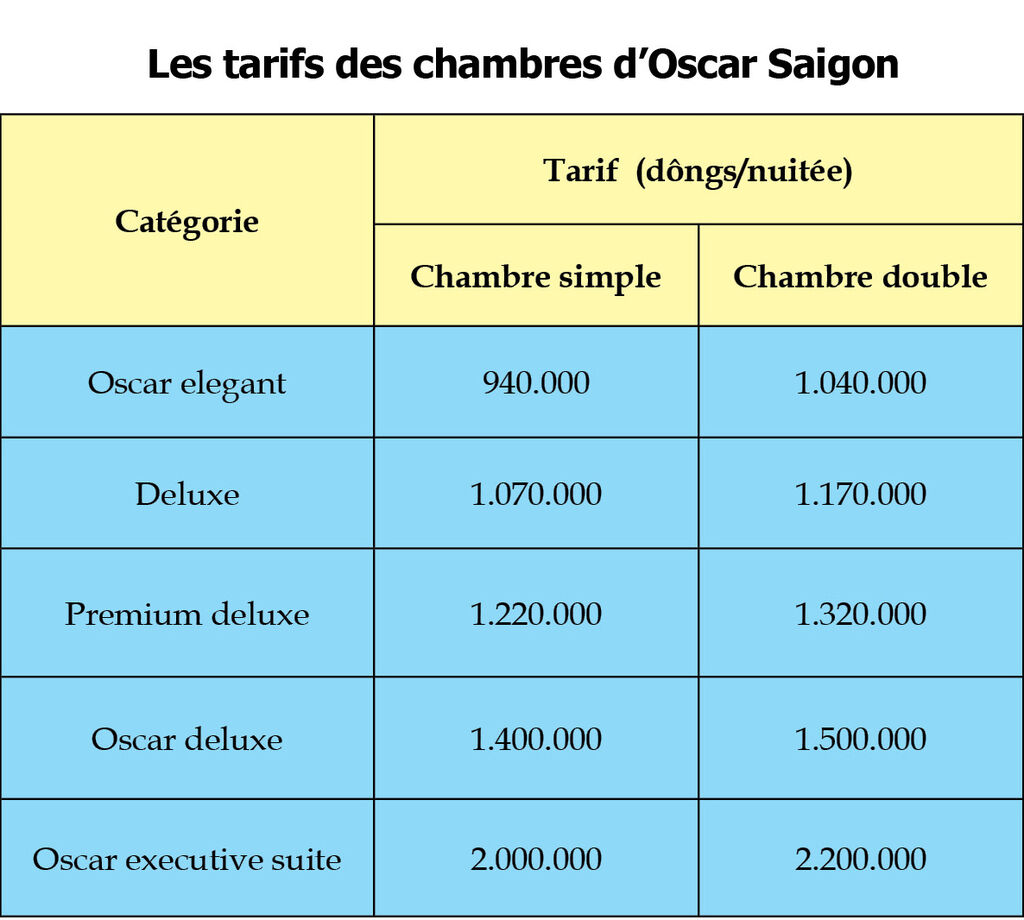 En ce qui concerne les cérémonies de mariage, l’hôtel propose un tarif de 5.000.000 dôngs par table pour une réservation de 15 tables ou plus. Ce tarif comprend de la bière Tiger, des boissons gazeuses pendant deux heures et demi, la musique, l’écran LED et une nuitée gratuite dans une chambre nuptiale. De plus, un bon est offert pour des séjours dans certains hôtels et villégiatures du groupe Saigontourist à Phu Yên (Centre), Dà Lat (province de Lâm Dông, hauts plateaux du Centre) et Phu Quôc (province de Kiên Giang, Sud).