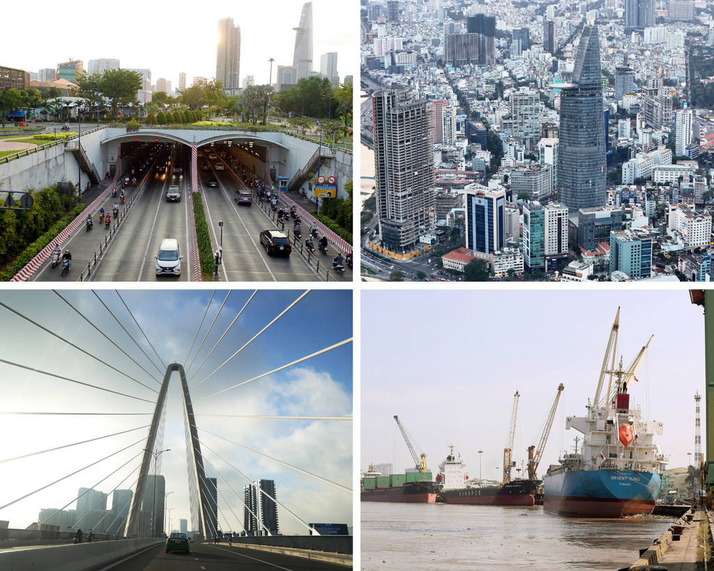 Parallèlement, Hô Chi Minh-Ville a encouragé les investissements dans les infrastructures afin de supprimer les goulets d'étranglement des connexions intra et interrégionales. Une série de projets d'infrastructures stratégiques, tels que les routes périphériques N°2, N°3 et N°4, les autoroutes Hô Chi Minh-Ville - Môc Bài et Hô Chi Minh-Ville - Bên Luc - Long Thành ; et la mise en service officielle de la ligne de métro N°1 (Bên Thành - Suôi Tiên). Par ailleurs, la ville promeut la construction du port international de transit de Cân Gio et d'une zone franche associée au port de Cai Mep - Thi Vai, créant ainsi de nouveaux pôles de croissance.