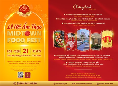 Le "Festival alimentaire Midtown" est la première activité officiellement organisée dans le plus grand immeuble d'appartements multifonctionnel de Phu My Hung et fait partie des événements célébrant le 29e anniversaire de la compagnie (19 mai 1993-19 mai 2022).