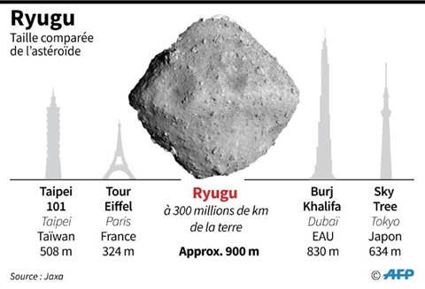 | Comparaison de la taille de l'astéroïde Ryugu avec des batiments terrestres élevés. |