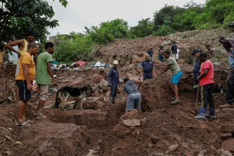 | Les services de secours et les familles s'efforcent de rechercher des disparus, dans le township de KwaNdengezi à Durban le 15 avril. |