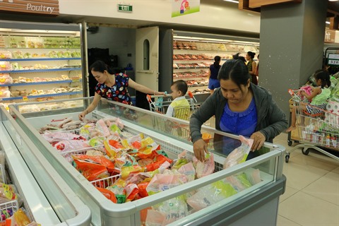 | Clients devant un rayon de fruits de mer au supermarché Co.opXtra, dans le 7e arrondissement de Hô Chi Minh-Ville. |