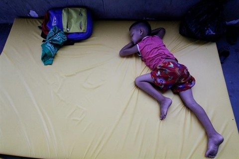 | Un petit garçon dort dans une salle de sport aménagée pour accueillir des Vénézuéliens fuyant leur pays, le 22 avril à Puerto Santander, en Colombie. |