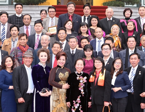 | La vice-présidente de la République, Nguyên Thi Doan (1er plan, centre), a reçu, le 10 février, une bonne centaine de Vietnamiens d'outre-mer participant au programme ''Printemps au pays ancestral 2015''. |