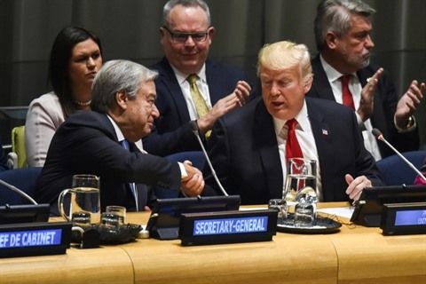 | Le président des États-Unis Donald Trump (droite) serre la main du secrétaire général de l'ONU Antonio Guterres à New York le 24 septembre. |