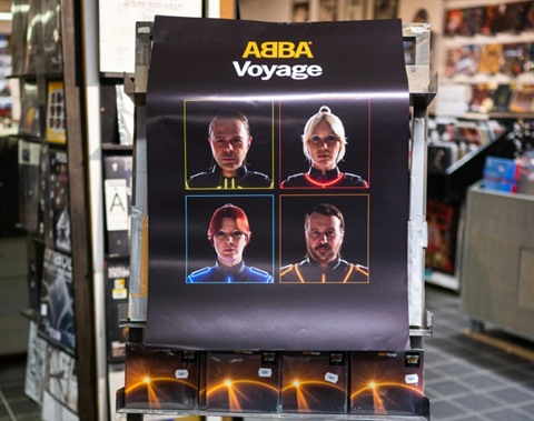 | Le nouveau disque du groupe suédois ABBA "Voyage" chez un disquaire de Stockholm, le 4 novembre 2021 |